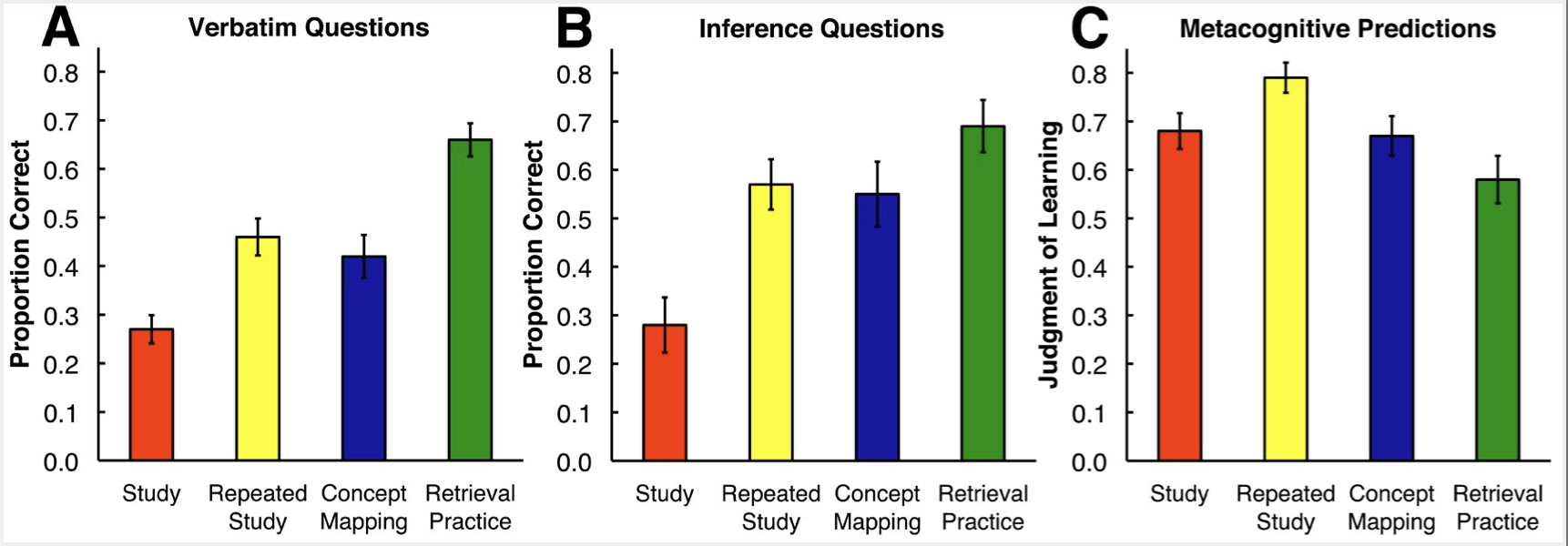 The below graphs illustrates how retrieval practice was most effective. The “Metacognitive Predictions” shows how students, ironically, underestimated how effective retrieval practice was.
