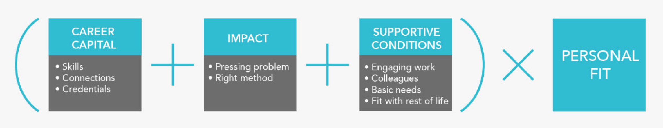 Recommended factors: Impact potential, personal fit, personal satisfaction, career capital, option value (if you pursue this, how good are your backup plans), value of information (is this a long-term option that you’re uncertain about and can test out?)